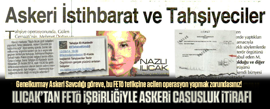 Fetocu terör örgütü tetikçisi Nazlı Ilıcak, resmen paralel çeteyle suç ortaklığı içinde askeri casusluk yaptığını itiraf etti. MEDYAGUNDEM.COM- Fetocu terör örgütünün (FETÖ) tetikçiliğini yapan Nazlı Ilıcak’ın köşesinden yayınladığı TSK’ya ilişkin bir belgeyle ilgili Genelkurmay askeri savcılığının soruşturma başlattığı geçtiğimiz gün medyaya yansıdı. Sözkonusu belgenin Genelkurmay kayıtlarından daha önce çıkarılmış ve …