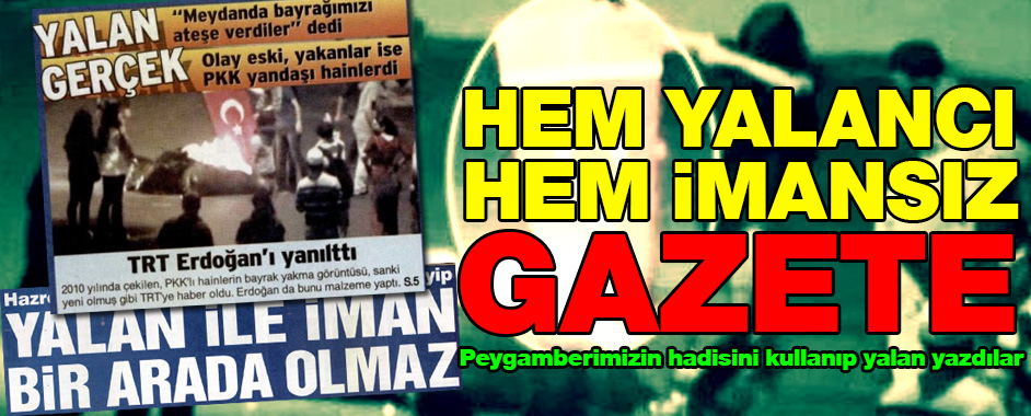 TRT, Taksim Gezi Parkı’ndaki olayları destek için Ankara’da düzenlenen gösterilerde Türk bayrağının yakılmasına yönelik yayınlanan haber ve görüntülerde manipülasyon yapıldığı iddialarını yalanladı. Yalanı bugün birinci sayfasına taşıyan gazete Sözcü idi. Peygamberimiz Hazreti Muhammed’in bir hadisine vurgu yaparak, “Yalan ile iman bir arada olmaz” manşeti atan gazete, TRT Haber’in 2010 yılında …