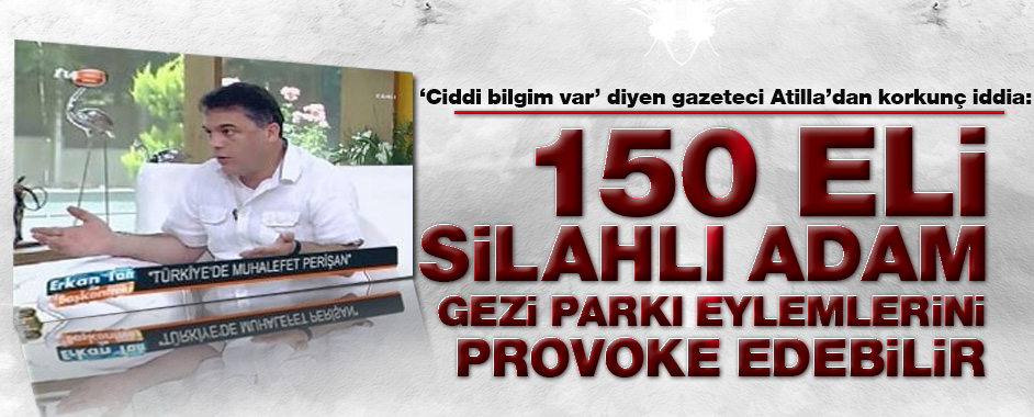 TV8’de canlı yayında Erkan Tan’ın sorularını yanıtlayan Talat Atilla Gezi Parkı eylemlerine ilişkin ürperten bir iddia da bulundu: “150 eli silahlı adam Gezi Parkı eylemlerini provoke edebilir.” TV8’de konuşan Talat Atilla sözlerine şöyle devam etti: “Gezi Parkı Eylemlerinde bundan sonra olabilecek önemli bir bilgiyi paylaşıyorum. Bu halk yürüyüşlerini provoke etmek …