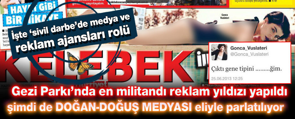 MEDYAGÜNDEM- Gezi Parkı’ndaki çapulcu sanatçıların en başındaki isim oydu. Kanal D’nin Yalan Dünya dizisinde “Vasfiye Teyze” rolüyle bilinen Gonca Vuslateri son olarak Başbakan Erdoğan’a küfreden tweet’iyle gündeme geldi. Ne ilginçtir ki, Gezi Parkı’nda en militan çapulcu Vuslateri önce bir Alman firmasının reklam yüzü yapıldı, şimdi de Vuslateri’nden Doğan medyası ve …