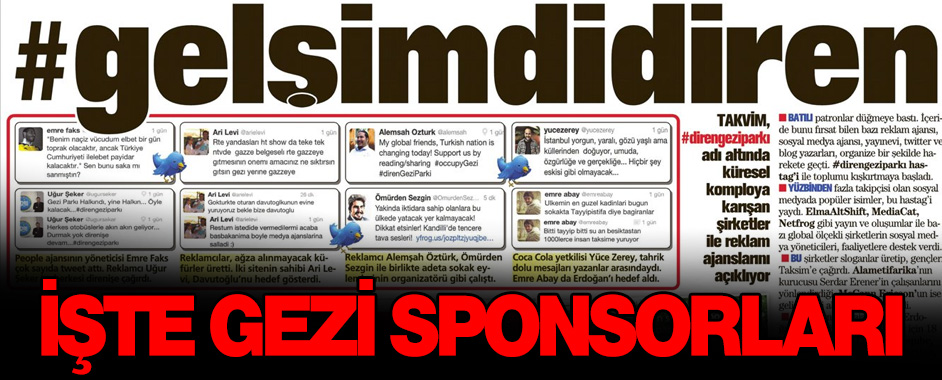 Başbakan Erdoğan’a sunulan rapora göre, sosyal medyadan yemeğe, ulaşımdan içeceğe kadar Gezi eylemlerinin organizasyonunda reklam ajansları, yabancı vakıflar, bir süpermarket zinciri ve bira firması rol aldı. Gezi Parkı’nda ağaçların kesilmesine itiraz olarak başlayan ve giderek Hükümet’e karşı direnişe dönüştürülen eylemin arkasında, dünya üzerinde gerçekleyen sosyal dönüşüm hareketlerindekine benzer bir organizasyon …