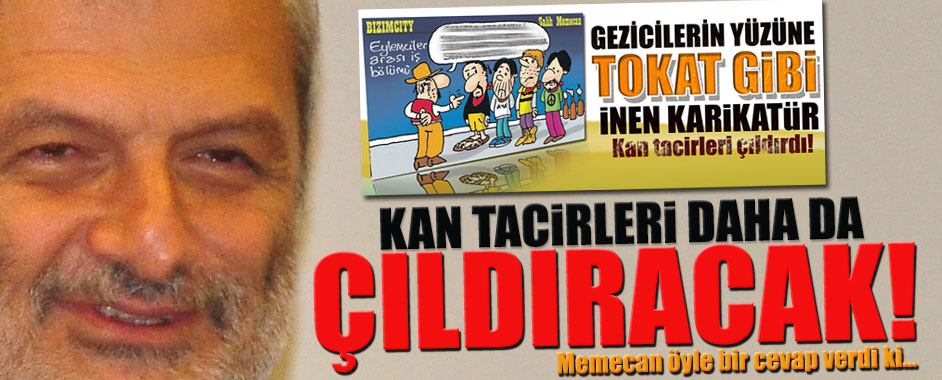 Sabah gazetesi karikatüristi Salih Memecan’ın bugünkü karikatürü Gezicileri kızdırdı. Memecan tam da Gezicilerin artık “kan tacirleri”ne nasıl dönüştüklerini çarpıcı biçimde çizmişti. Başta sosyal medya olmak üzere tepkilerin hedefindeki karikatürde eylemcilere iş bölümü yaptıran kişi, “Sen taş atacaksın, sen molotof atacaksın, sen barikat kuracaksın, sen öleceksin” talimatı veriyor. İŞTE O KARİKATÜR