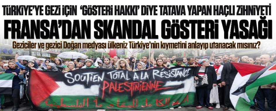 MEDYAGUNDEM.COM- Gezi kalkışması için “gösteri hakkı” diye Türkiye’ye yapmadığı kalmayan ülkelerden Fransa, Paris’te Cumartesi günü düzenlenecek Filistin’e destek eylemini yasakladı. Fransa Filistin için, katil İsrail’i protesto etmek için Paris’te meydanlara çıkacak olanları hapisle tehdit etti. Gezi kalkışmasında Türkiye’de “özgürlük yok” diye uluslararası baskıya kalkışan ülkelerden Fransa, direk sokağa çıkana yasak koydu, …