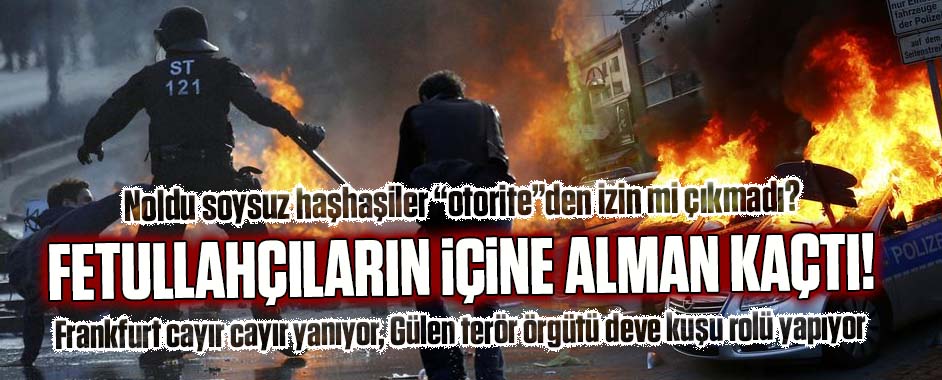 Almanya’da Avrupa Merkez Bankası’nın yeni binasının açılışı için düzenlenen protesto gösterilerinde çok sayıda kişi gözaltına alındı. Frankfurt resmen yanarken, Türkiye’de Gezi kalkışması için “Direnin” diyerek destek veren Almanya, şimdi kendi ülkesinde yaşananlar için “kaos” dedi. Fetullahçı terör örgütü ise Almanya’daki olayları haber bile yapmadı. Bu da “soysuz haşhaşiler ‘otorite’lerinden izin …