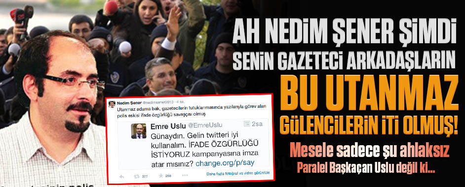 Gazeteci Nedim Şener, “Paralel Başkaçan” Emre Uslu’yu rezil rüsva etti. MEDYAGUNDEM.COM- Fetullahçı terör örgütünün en mağdur ettiği gazetecilerden biridir Nedim Şener… Twitter’da kendi çapında Gülencilerle mücadele eder ama gelin görün ki sesi ne patronu Aydın Doğan için çıkar, ne de bugün her biri paralel örgüte tetikçi olmuş gazeteci arkadaşları için…. Şener …