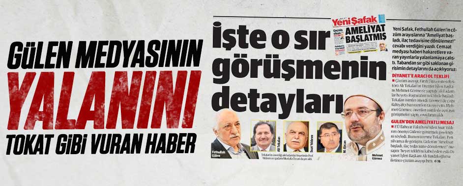 Yeni Şafak, 17 Aralık darbe girişiminin ardından Fethullah Gülen’in çözüm arayışlarına ‘Ameliyat başladı, ilaç tedavisine dönülemez!’ cevabı verdiğini yazdı. Cemaat medyası haberi hakaretlere varan yayınlarla yalanlamaya çalıştı. Diyanet İşleri Başkanı Görmez’e ‘aracı ol’ teklifiyle başlayan ve cemaat tabanından sır gibi saklanan girişimin detaylarını da açıklıyoruz… Fethullah Gülen’in 17 Aralık darbe …