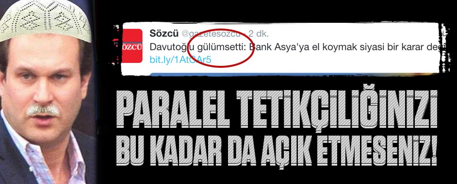 Sözcü gazetesinin paralel örgütün bir operasyon gazetesi olduğunu gösteren yeni detay… MEDYAGUNDEM.COM- Paralel tetikçi denilince inkar ediyorlar. Oysa paçalarından “paralel tetikçilik” akıyor… İşte Sözcü gazetesi. Sahibi Burak Akbay’ın Gülen örgütünün evlerinden yetiştiği sık sık gündeme gelen Sözcü gazetesi “paralel tetikçi” olduğunu yine açık etti. Başbakan Ahmet Davutoğlu’nun bu gece Kanal …