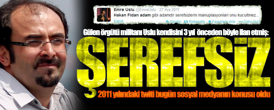MEDYAGUNDEM.COM- İsrail ve Neo-Conlarla paralel biçimde MİT Müsteşarı Hakan Fidan’a karşı saldırıya geçen Gülen örgütü militanı Emre Uslu’nun 2011 yılında attığı bir tweet, sosyal medyada günün konusu oldu. Uslu Hakan Fidan için 3 yıl önce “Hakan Fidan adam gibi adamdır, şerefsizlerin manipülasyonları onu küçültmez” diye yazmıştı. Ne ilginçtir ki bunu …