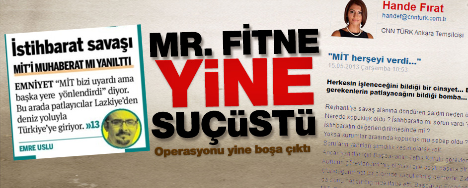 MEDYAGÜNDEM- Reyhanlı 50 masum insan katledildi, ama ruhları ve vicdanları kapkara/kaskatı birileri kan üzerinden hesaplaşma derdine düştü. İşye o kapkaranlıklardan biri de “Mr. Fitne” lakaplı Taraf yazarı Emre Uslu. Artık patolojik hal almış “MİT takıntısı” ile bugün de Taraf’taki köşesinde MİT’i hedef tahtasına koydu. MİT’in bir zaafı varsa da Emre …