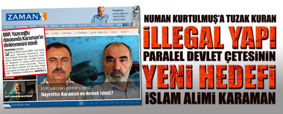 MEDYAGUNDEM.COM- Numan Kurtulmuş’a alçakça yalan bir “seks kaseti tuzağı” kuran “cemaat içindeki illegal yapı” ve “paralel devlet çetesi” şimdi de İslam alimi Hayrettin Karaman’ı hedef aldı. Geçtiğimiz gün “Türkiye’nin dostları ve düşmanları” başlıklı yazısında verdiği Muhsin Yazıcıoğlu örneği üzerinden Hayrettin Karaman’ı bugün Zaman gazetesi birinci sayfasından hedef yaptı, BBP de …