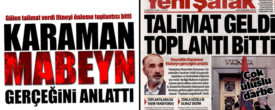 Yazarımız Hayrettin Karaman, Gazeteciler Yazarlar Vakfı’yla gerçekleştirilen ve Fethulllah Gülen’in ‘ara verin’ dediği Mabeyn toplantılarının iptal edilme sürecini anlattı. Kasım’da fitnenin önlenmesi için biraraya gelineceğini söyleyen Karaman “Toplantı engellendi” dedi. Fethullah Gülen’in Samanyolu Yayın Grubu Başkanı Hidayet Karaca ile 10 Kasım 2013 tarihli görüşmesinde Mabeyn toplantılarına ‘davet etmeyin’ dediği Yeni …