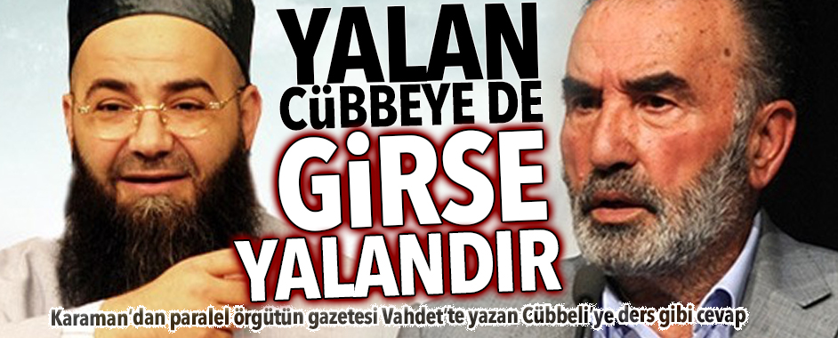 Cübbeli Ahmet’in geçtiğimiz günlerde Yeni Şafak gazetesi yazarı Hayrettin Karaman’a yönelik eleştirilerine Karaman bugünkü köşesinden Cübbeli’ye ‘Yalan cüppeye de girse yalandır” mesajıyla cevap verdi. Karaman, paralel örgütün operasyon gazetesi Vahdet’te yazan Cübbeli Ahmet’e ders gibi bir cevap verdi. İşte yazısı: YALANCI HANGİ KILIĞA GİRERSE GİRSİN FASIKTIR Yalancı hangi kılığa girerse …