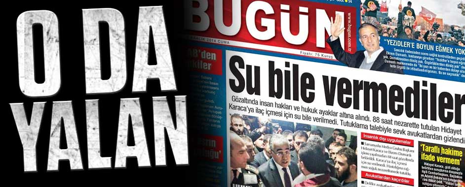 Paralel medyanın 3 gündür yürüttüğü “Su verilmedi” masalı da fos çıktı. Savcılığın gözaltındaki gazetecilerin her birine 4 su verdiği, yemek ihtiyaçlarının polisler tarafından karşılandığı ve rahat etmeleri için nezarethanede değil mescitte uyumalarına izin verildiği öğrenildi. Paralel Medya yalana doymuyor. 3 gündür “Samanyolu Grup Başkanı Hidayet Karaca ilaç içmek için su …