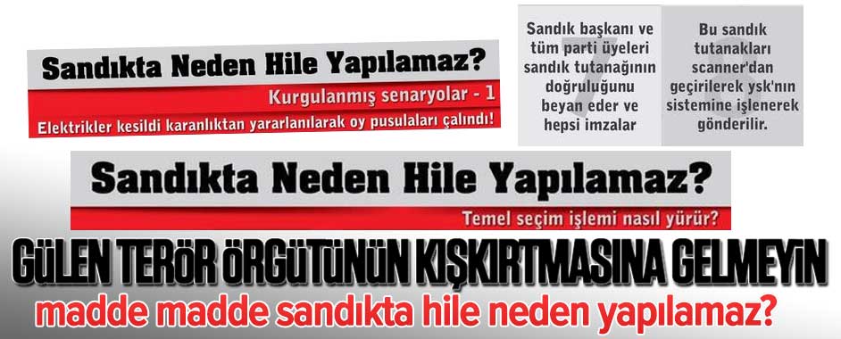 DevamıGülen terör örgütünün kışkırtmasına gelmeyin, sandıkta hile neden yapılamaz?