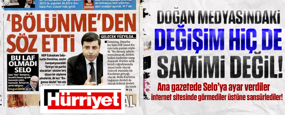 Doğan medyasında yaşanan değişimi sorguladığımız HDP Eşbaşkanı Demirtaş’ın skandal bölücü çıkışına dair haberin Hürriyet’in internet sitesinde nasıl perdelendiğini yazdık, Özkök’ün Selo’ya verdiği ayarın hurriyet.com.tr’de yer almadığını deşifre ettik. Haberimizin ardından hurriyet.com.tr apar topar Özkök’ün Selo’ya verdiği ayarı hemen yayına aldı.