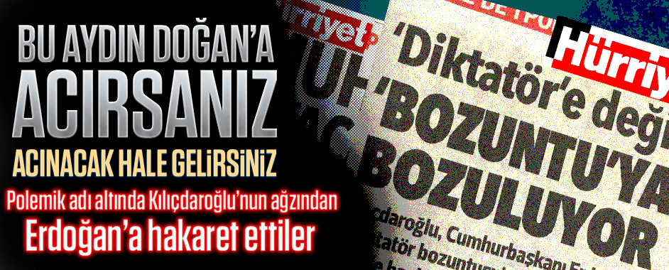 Daha önce birçok kez tüm parti ve liderlere eşit mesafede olduğu yalanına sığınan Aydın Doğan medyası, CHP Genel Başkanı Kemal Kılıçdaroğlu’nun Cumhurbaşkanı Recep Tayyip Erdoğan’a hakaretleri üzerinden algı operasyonu yapmaya devam ediyor. Türkiye Cumhuriyeti Cumhurbaşkanı hakkında ağza alınmayacak ifadelerde bulunup “Diktatör bozuntusu” diyen Kılıçdaroğlu’na her kesimden tepki yağdı. Ancak Hürriyet …