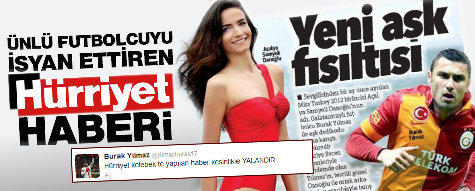 MEDYAGÜNDEM- Galatasaray’ın yıldız futbolcusu Burak Yılmaz, bugün Hürriyet Kelebek’te yayınlanan hakkındaki habere ateş püskürdü. Twitter’dan “Her gün özel hayatım ile alakalı haber yapılıyor ama asla ve asla hiçbirisi doğru değildir” açıklamasını yapan Yılmaz’la ilgili Hürriyet Kelebek’te, “Tescilli güzel Açelya Samyeli’in adı, ayrılıktan kısa süre sonra Galatasaraylı futbolcu Burak Yılmaz ile …