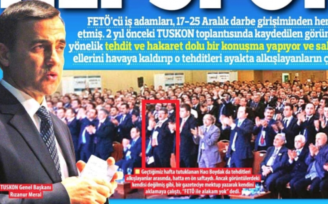 17-25 Aralık darbe girişiminin başarıya ulaşacağından emin olan FETÖ’cü işadamları bir araya gelerek hükümete tehdit yağdırmıştı. O gün TUSKON Başkanı Meral’in ‘kaçacak in arayacaklar’ sözüne alkış tutanlar, bugün kaçacak delik arıyor. Elleri patlayıncaya kadar alkış tutanlar arasında Boydak ailesinden Hacı Boydak da en ön saftaydı. FETÖ’den tutuklanan Boydaklar için dün …
