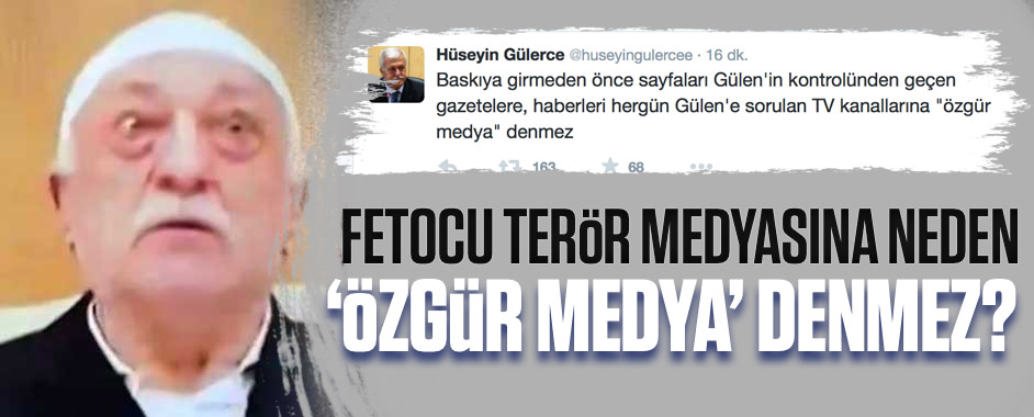 Fetullah Gülen’in 35 yıl boyunca yanındaki en yakın isimlerden biri olan yazar Hüseyin Gülerce, Fetocu terör medyasının neden “özgür medya” olamayacağını Twitter’da çarpıcı biçimde değerlendirdi. * Baskıya girmeden önce sayfaları Gülen’in kontrolünden geçen gazetelere, haberleri hergün Gülen’e sorulan TV kanallarına “özgür medya” denmez. * Balyoz ve Ergekon davalarında, sahte belgelerle, …