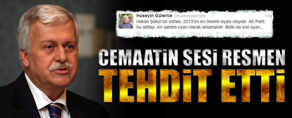 MEDYAGUNDEM.COM- Cemaat yazarı Hüseyin Gülerce Twitter’dan verdiği bir mesajda resmen AK Parti’yi tehdit etti. Hakan Şükür’ün istifasını 2013 yılının en önemli olayı olarak değerlendiren Gülerce, “AK Parti, bu istifayı, en samimi uyarı olarak anlamalıdır. Belki de son uyarı…” diye yazdı. Gülerce’nin “son uyarı” sözü Ak Parti’ye yönelik tehdit olarak algılandı. İşte …