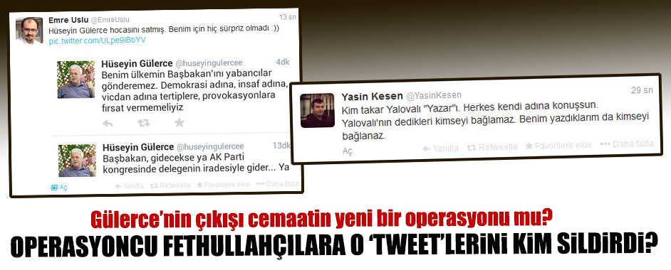 MEDYAGUNDEM.COM- Rasim Ozan dün A Haber’de çıktığı canlı yayında demişti ki; “Cemaat bölündü.” Ve 24 saat geçmeden haklı çıktı. Cemaatin etkin isimlerinden Hüseyin Gülerce bugün Twitter’da yaptığı bomba açıklamalarla cemaatin taşeronu olduğu ve Başbakan Erdoğan’a karşı yürütülen darbe tezgahını yerle bir etti. Bu saatten sonra cemaat adına kimse “yolsuzluktu, hukuktu, …