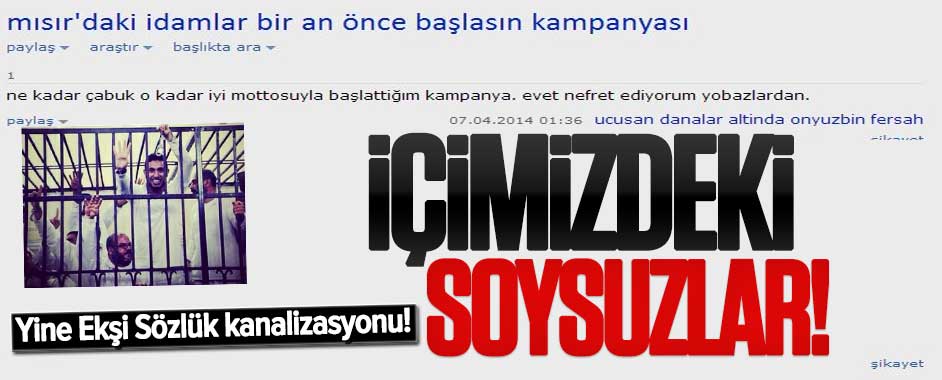 Ekşi Sözlük’te açılan bir başlıkta Mısır’da 529 kişi hakkında alınan idam kararının bir an önce uygulanması için kampanya başlatıldı. Mısır’da darbe yaparak Mursi’yi deviren Sisi’ye bağlı mahkeme, darbe sonrası çoğunluğunu Müslüman Kardeşler’in oluşturduğu ve darbeyi protesto eden 529 kişi hakkında idam kararı verdi. 529 KİŞİ İDAM EDİLECEK “Şiddete teşvik” suçlamasıyla …