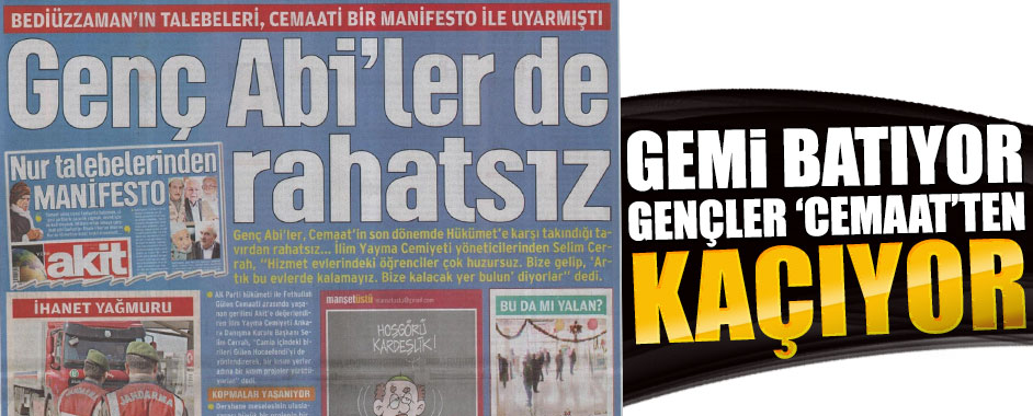 Genç Abi’ler, Cemaat’in son dönemde Hükümet’e karşı takındığı tavırdan rahatsız… İlim Yayma Cemiyeti yöneticilerinden Selim Cerrah, “Hizmet evlerindeki öğrenciler çok huzursuz. Bize gelip, ‘Artık bu evlerde kalamayız. Bize kalacak yer bulun’ diyorlar” dedi. Türkiye’nin dört bir yanında İmam-Hatip okulları yapan, Kur’an Kursları açan, yurtlar inşa eden ve dindar insan yetiştiren …