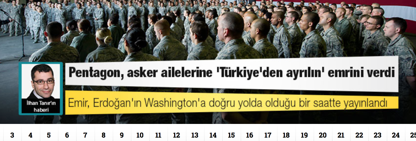 Amerikan Savunma Bakanlığı, İncirlik Askeri Üssü’nün bulunduğu Adana ile Muğla ve İzmir’deki askeri personelinin yakınlarından bulundukları kentleri terk etmelerini istedi. Bu haber vatan haini ve Türkiye düşmanı Fetocu terör örgütünü heyecanlandırdı! MEDYAGUNDEM.COM- FETÖ-PKK gazetesi Cumhuriyet ile, FETÖ-PKK tetikçisi site Haberdar’a aynı anda servis yapan FETÖ’nün Washington muhabiri İlhan Tanır gelişmeyi …