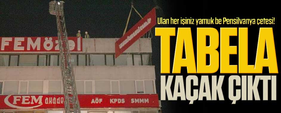 FEM’in kaçak tabelasının neden kaldırıldığını, paralel örgütün suçlamalarının neden dayanaksız olduğunu belgelerle ortaya çıktı. İstanbul Büyükşehir Belediyesi Zabıta Ekipleri FEM Dersanesi’nin Şişli Mecidiyeköy’deki binasındaki kaçak tabelasını kaldırdı… FEM Dersaneleri işi Büyükşehir Belediye Başkanı Kadir Topbaş hakkında suç duyurusunda bulunmaya kadar götürdü… “Belediye tebligat yapmak zorundaydı…” şeklindeki gerekçeleri ise tuhaf karşılandı. …