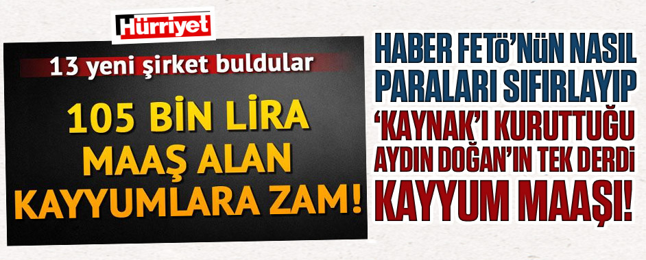Geçtiğimiz günlerde kayyum atanan paralel yapının finans kaynağı Kaynak Holding’de büyük usulsüzlükler yapıldığı ortaya çıktı. Kaynak Holding’in paraları nasıl sıfırladığı tek tek tespit edilirken, Hurriyet.com.tr kafayı kayyumlara taktı, haberi FETÖ’nün “Kaynak”ı kurutması üzerinden değil kayyumların maaşından gördü. Bu da Aydın Doğan’ın hala FETÖ ile iş tuttuğunun göstergesi oldu. Kaynak Holding’de …