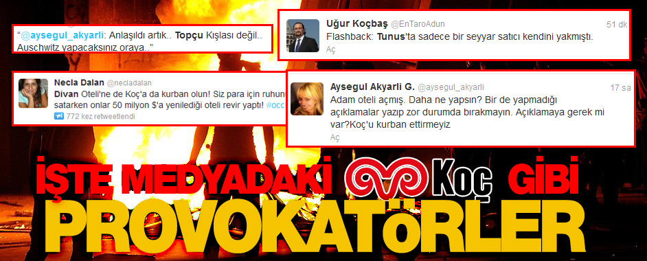 Başbakan Erdoğan Kazlıçeşme’deki konuşmasında çapulculara oteli Divan’ı da açan Koç’a da vurarak, ” Yazılı ve görsel medyaya sesleniyorum; dürüst olun namuslu olun namuslu. Bu gerçekleri yazın. eğer Tayyip Erdoğan’dan dürüst olmamayı bekliyorsanız yanılıyorsunuz. Bunlar bugüne kadar güdülen iktidarlara alışmıştı. İstedikleri gibi hükümet kuruyorlardı. İstediklerini indiriyorlardı. Türkiye’de bazı medya kuruluşları aynı oyunun …