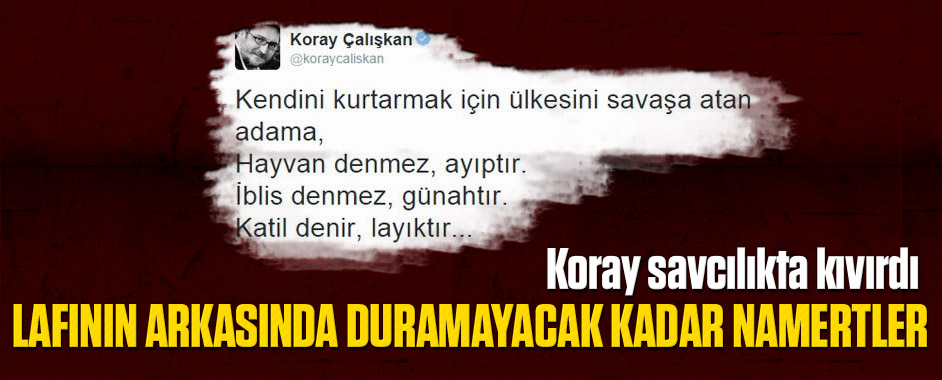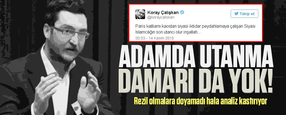 Hemen her toplumsal olaydan sonra ve milli maç beraberliğini bile Cumhurbaşkanı Erdoğan’a bağlayan CHP’nin akıl hocası Koray Çalışkan, Fransa’yı kana bulayan terör saldırılarından sonra attığı twitle çıldırttı. Koray Çalışkan, Fransa’daki eş zamanlı terör saldırılarından Müslümanları sorumlu gösterip, “Paris katliamı kaostan siyasi iktidar peydahlamaya çalışan Siyası İslamcılığın son utancı olur inşallah…” …