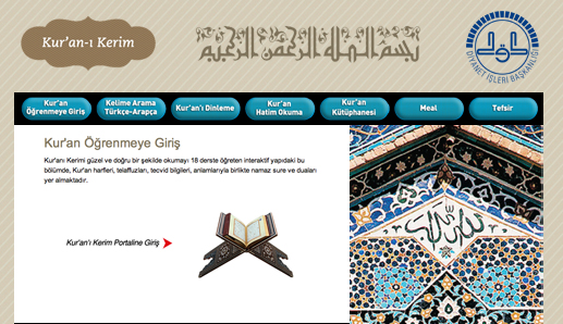 Diyanet İşleri Başkanlığı tarafından hazırlanan, Kur’an-ı Kerim hakkında geniş bir içeriğe sahip “Kur’an-ı Kerim Portalı”, http://kuran.diyanet.gov.tr adresinde kullanıma açıldı. Kur’an-ı Kerim portalında Kur’an-ı Kerim okumaya girişten tefsir okumalarına kadar pek çok hizmetten faydalanılabiliyor. “Kur’an Öğrenmeye Giriş”, “Kelime Arama”, “Kur’an Dinleme”, “Hatim Okuma”, “Kur’an Kütüphanesi”, “Meal”, “Tefsir”, “Sureler ve Konu Fihristi” …