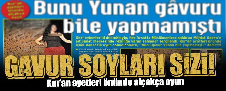 Gezi eylemlerini destekleyip, her fırsatta Müslümanlara saldıran Müjdat Gezen’e ait Sanat Merkezi’nde rezilliğe varan sahneler sergilendi. Kur’an âyetleri önünde içkili, dansözlü oyun sahnelenmesi, “Bunu gâvur Yunan bile yapmamıştı” dedirtti. CHP’li Konak Belediyesi’nin mülkiyetinde olan Türkan Saylan Kültür Merkezi’nde faaliyet gösteren Müjdat Gezen’e ait Müjdat Gezen Sanat Merkezi’nde büyük rezilliklerin yaşandığı …