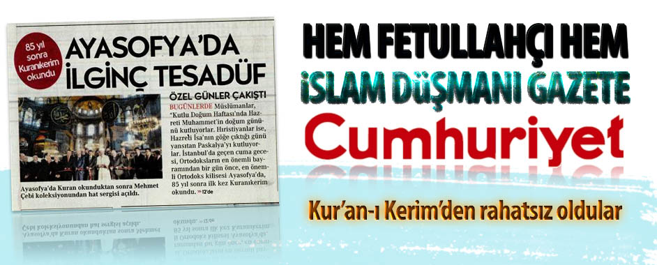 Fetullahçı gazete Cumhuriyet, Ayasofya’da Kur’an-ı Kerim okunmasından da rahatsız oldu. Kutlu Doğum Haftası etkinlikleri kapsamında Aşk-ı Nebi sergisi Ayasofya’da açıldı. Diyanet İşleri Başkanı Mehmet Görmez’in de katıldığı sergide Kur’an tilaveti ile ezan okundu. CAN DÜNDAR’IN GAZETESİ RAHATSIZ OLDU Can Dündar’ın genel yayın yönetmeni olduğu paralel tetikçi Cumhuriyet gazetesi, Ayasofya’da Kur’an-ı …