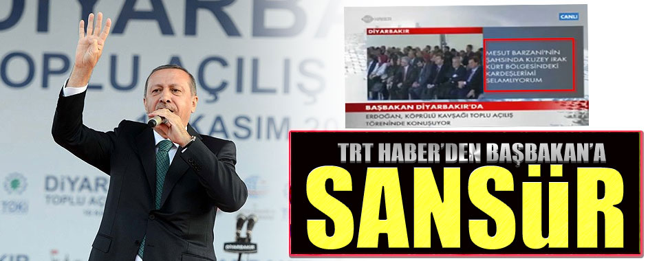 Başbakan Erdoğan’ın Diyarbakır’daki konuşmasını TRT Haber sansürleyerek verdi… Başbakan Recep Tayyip Erdoğan Diyarbakır’da yaptığı konuşmada ilk kez Kürdistan kelimesini kullandı ve “Kuzey Irak Kürdistan Bölgesi’ndeki değerli kardeşlerimizi muhabbetle selamlıyorum” dedi.Başbakan Erdoğan konuşması sırasında “Kuzey Irak Kürdistan bölgesindeki değerli kardeşlerimizi muhabbetle selamlıyorum” dedi, fakat TRT Haber ekranında bu konuşması “Mesut Barzani’nin …