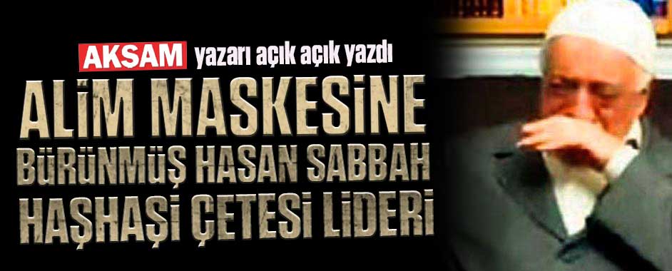 Akşam gazetesi yazarı Kurtuluş Tayiz bugün açık açık Fetullah Gülen için “Alim maskesine bürünmüş bir Hasan Sabbah, haşhaşi çetesi lideri” diye yazdı. Yazısında Gülen’in yolsuzluk kılıfında nasıl bir darbeye kalkıştığının ve sonunu bizzat kendisinin hazırladığını anlattı. Yazısı şöyle: “ALİM” MASKESİNE BÜRÜNMÜŞ BİR “HASAN SABBAH” 17 Aralık, siyasi tarihimizin dönüm noktalarından …