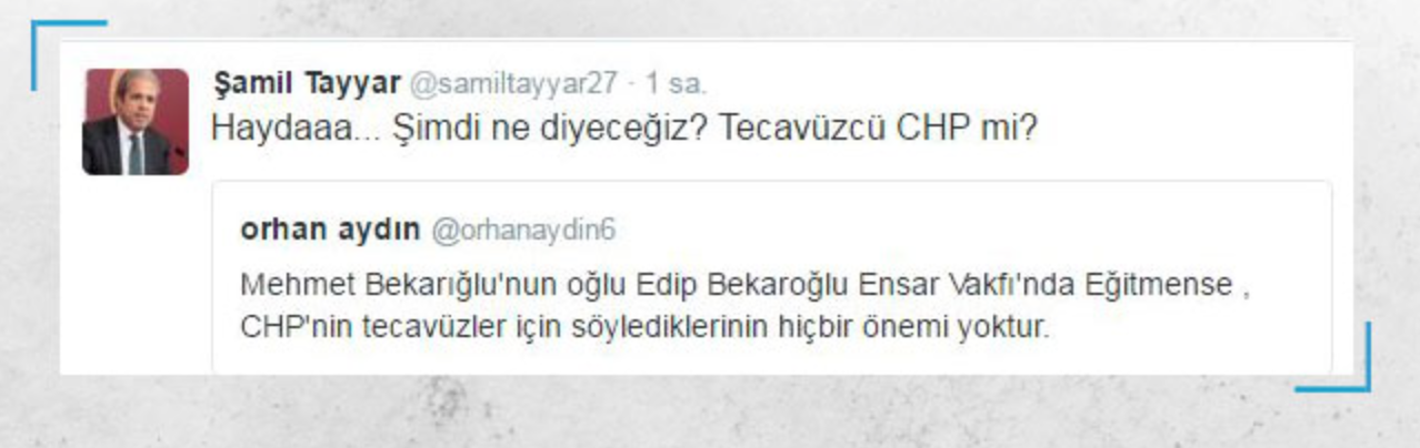 CHP’li Mehmet Bekaroğlu’nun oğlu Edip Bekaroğlu’nun Ensar Vakfı’nda eğitmen olarak görev yaptığı öğrenilirken, Şamil Tayyar’dan olayla ilgili bomba bir tweet geldi. CHP İstanbul Milletvekili Mehmet Bekaroğlu, CHP Genel Başkanı Kemal Kılıçdaroğlu’nun Aile ve Sosyal Politikalar Bakanı Sema Ramazanoğlu’na yönelik hakaretleri üzerine tartışmaya katılmıştı. ENSAR VAKFI’NDA SUNUM YAPTI Bekaroğlu, “Bana kalırsa …