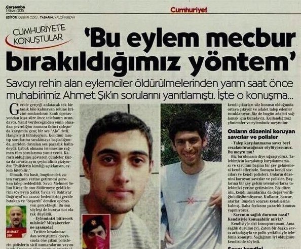 Bugün FETÖ ve PKK terör örgütlerine tetikçilik yapan Cumhuriyet gazetesi, geçen yıl savcı Mehmet Selim Kiraz DHKP-C terör örgütü tarafından şehit edildiğinde, teröristleri savunan da gazeteydi. Gazeteci kılıklı Ahmet Şık teröristlere tetikçilik yapmış, “Bu eylem mecbur bırakıldığımız yöntem” başlığıyla yayınlanan habere teröristler savunulmuştu. Tıpkı Hürriyet’in savcının o fotoğrafını manşet yapması …