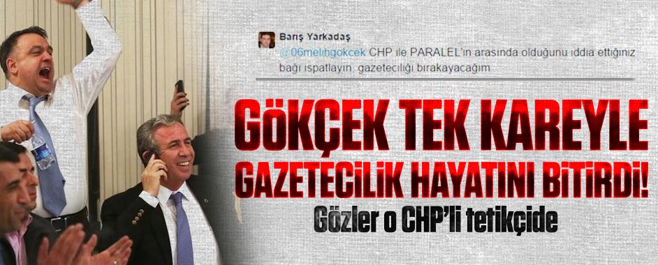 Cemaat-CHP bağlantısını ispat et diyen gazeteciye, Ankara Büyükşehir Belediye Başkanı Melih Gökçek tek kareyle cevap verip, gazetecilik hayatını bitirdi. Şimdi gözler onuru varsa Yarkadaş’ın çekip gitmesnde… Melih Gökçek, CHP’li gazeteciyi sosyal medyada fena yakaladı. Gerçek Gündem’in Genel Yayın Yönetmeni Barış Yarkadaş’ın “CHP ile Cemaat arasındaki bağlantıyı açıkla gazeteciliği bırakırım” sözleri …