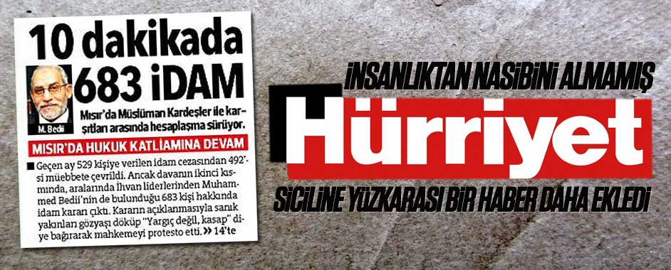 MEDYAGUNDEM.COM- Hürriyet gazetesi bugün insanlık tarihine yüzkarası olarak geçecek, insanlıktan nasiplenmemiş biçimde nefretle anılacak bir habere imza attı. Hürriyet, tüm insanlığın vicdanı yaralayan 683 İhvan mensubu hakkında verilen idam kararını, ““Mısır’da Müslüman Kardeşler ile karşıtları arasında hesaplaşma sürüyor” şeklinde ifadelerle ilk sayfasına taşıdı. Hürriyet, Mısır’da Müslüman Kardeşlere darbe yapılmasını, yöneticilerinin …
