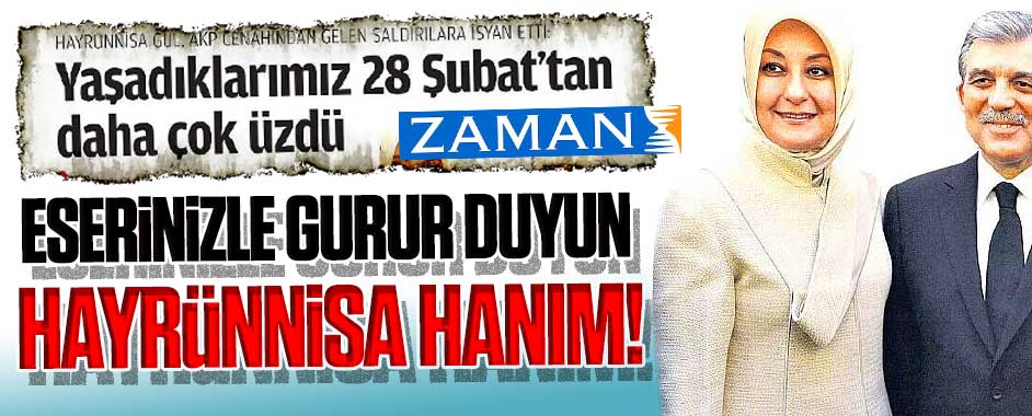 Cumhurbaşkanı Abdullah Gül’ün veda resepsiyonunda yaptığı açıklamalarla seçilmiş Cumhurbaşkanı Erdoğan’ı hedef alan Hayrünnisa Gül Cumhuriyet, Zaman ve Hürriyet’in manşetini süsledi. Hayrünnisa Gül, “Bir turnusol döneminden geçiyoruz. Bu süreçte bazı yaşadıklarımızı, 28 Şubat döneminde benim başörtümün tartışıldığı günlerde bile yaşamadık. Şimdi ben de susuyorum, ama fazla susmayacağım; asıl intifadayı (ayaklanmayı) ben …