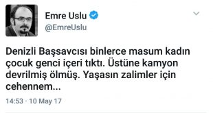 Hayatını kaybeden Denizli Cumhuriyet Başsavcısı Mustafa Alper hakkında iğrenç paylaşımlarda bulunan Emre Uslu hakkında soruşturma başlatıldı. FETÖ başsavcıya suikasti üstlendi! Denizli’de trafik kazasında hayatını kaybeden Denizli Cumhuriyet Başsavcısı Mustafa Alper hakkında sosyal medyada paylaşımlarda bulunan Fetullahçı Terör Örgütü (FETÖ) firarisi Emre Uslu hakkında Sakarya Cumhuriyet Başsavcılığınca soruşturma başlatıldığı bildirildi. Sakarya …