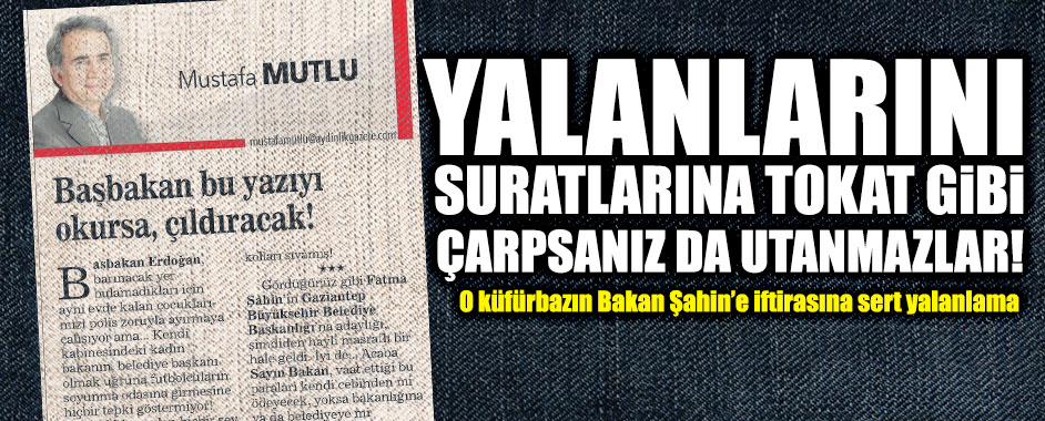 MEDYAGUNDEM.COM- Bunların yüzüne yalanı tokat gibi vursanız göbek atarlar! İşleri, güçleri yalan, iftira… İşte Aydınlık yazarı Mustafa Mutlu. Bugün köşesinde Aile ve Sosyal Politikalar Bakanı Fatma Şahin’le ilgili iddiaları baştan sona yalan çıktı. Bakanlık tarafından yapılan açıklamada Mutlu’nun yalanı şöyle duyuruldu: ****** Aydınlık Gazetesi’nin 27.11.2013 tarihli sayısında yer alan “Başbakan …