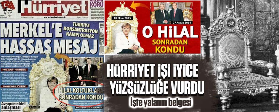 Hürriyet gazetesinin Cumhurbaşkanı Recep Tayyip Erdoğan’ın Almanya Başbakanı Angela Merkel’i ağırladığı Yıldız Sarayı Mabeyn Köşkü’ndeki koltuklarla ilgili haberleri yalan çıktı. Hürriyet “Hilal sonradan kondu” diyerek, haberde Abdülaziz döneminde Fransa’dan getirilmiş olan koltukların depoda bulunup onarıldığını, 2014’te Fas Kralı 6. Muhammed’in ziyareti sırasında koltuklarda hilal olmadığını, ancak pazar günkü ziyarette ortadaki …