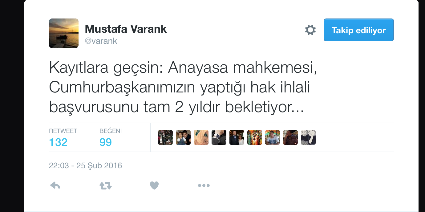 Can Dündar ile Erdem Gül’ün bireysel talebini jet hızıyla gündemine alan Anayasa Mahkemesi’nin Cumhurbaşkanı Erdoğan’ın yaptığı hak ihlali başvurusunu 2 yıldır beklettiği ortaya çıktı. Şok detayı Erdoğan’ın başdanışmanı Mustafa Varank Twitter’da açıkladı.