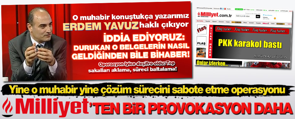 MEDYAGÜNDEM- Yine o muhabir, yine Milliyet, yine çözüm sürecini sabote etme operasyonu… PKK, Lice’deki karakol protestosunda bir gencin ölümüne misilleme olarak Diyarbakır’da bir karakola düzenledikleri saldırıda bir askerin öldürüldüğünü iddia etti. Haber Diyarbakır Valiliği tarafından yalanlandı. Ancak Milliyet internet sitesi Namık Durukan imzasıyla “flaş haber” diyerek haberi hiçbir sorgulamaya gerek …