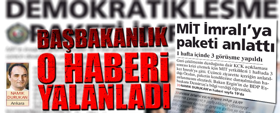 Başbakanlık Basın Merkezi bugün Milliyet gazetesinde yayınlanan “MİT İmralı’ya paketi anlattı” başlığıyla verdiği haberi sert bir açıklamayla yalanladı. Başbakanlık Basın Merkezinden yapılan açıklamada, demokratikleşme paketinin ilgili makamlar dışındaki kişilerle görüşme konusu yapıldığı iddialarının tümüyle gerçek dışı olduğu bildirildi. Açıklamada, Milliyet gazetesindeki habere atıfta bulunularak, “demokratikleşme paketinin ilgili makamlar dışındaki kişilerle …