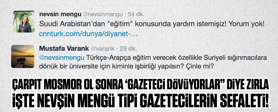 Medyadaki Nevşin Mengü tipi gazetecilerin cibilliyetini, sefaletini, işin özünde İslam’la olan dertlerini iyi gösteren bir örnek… Daha önce teröre “terör” demediği için terör yanlısı çizgisiyle gündeme gelen CNN Türk spikeri Nevşin Mengü “Suudi Arabistan’dan ‘eğitim’ konusunda yardım istemişiz! Yorum yok!” diye bir tweet attı. Tweetinde link verdiği cnnturk.com haberinde meselenin …