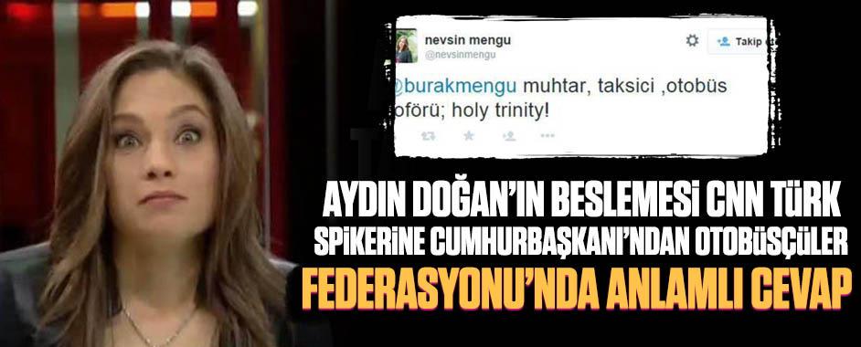 Aydın Doğan’ın sahibi olduğu CNN Türk ekranlarında ana haber spikerliği yapan Nevşin Mengü’nün şoförleri aşağılamasına Cumhurbaşkanı Erdoğan tepki gösterdi. Erdoğan, “Eski CHP milletvekillerinden birinin kızı TV spikeri bir hanımefendi bizim otobüs şoförleriyle buluşmamızı içine sindirememiş. Kendince başkanlık sistemiyle otobüs şoförleriyle dalga geçiyor. Muhtar, taksici otobüs şoförü üçlüsü diyor adeta kin …
